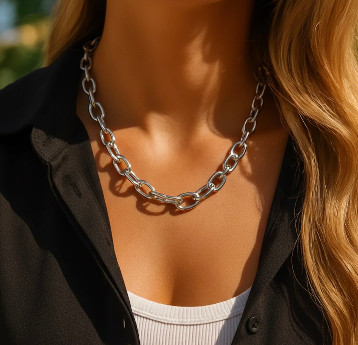 OVAL LINK NECKLACE- Eine zeitlose Halskette mit T-Bar-Verschluss. Die Kette besteht aus mittelgroßen Gliedern in ovaler Form, was die Halskette sowohl stilvoll als auch auffällig macht. Das Design ist so gestaltet, dass es in seiner Schlichtheit einen kraftvollen und eleganten Ausdruck vermittelt. Kombinieren Sie es mit dem OVAL LINK BRACELET für einen kompletten Look.