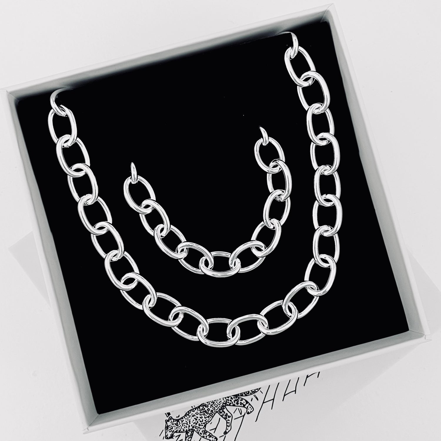OVAL LINK SET - a complete jewelry set featuring a matching necklace and bracelet. OVAL LINK NECKLACE and OVAL LINK BRACELET are designed to make a bold yet elegant statement through their refined simplicity. Both pieces feature oval-shaped links and an exclusive T-bar clasp. Delivered in our signature BYBORN jewelry box.