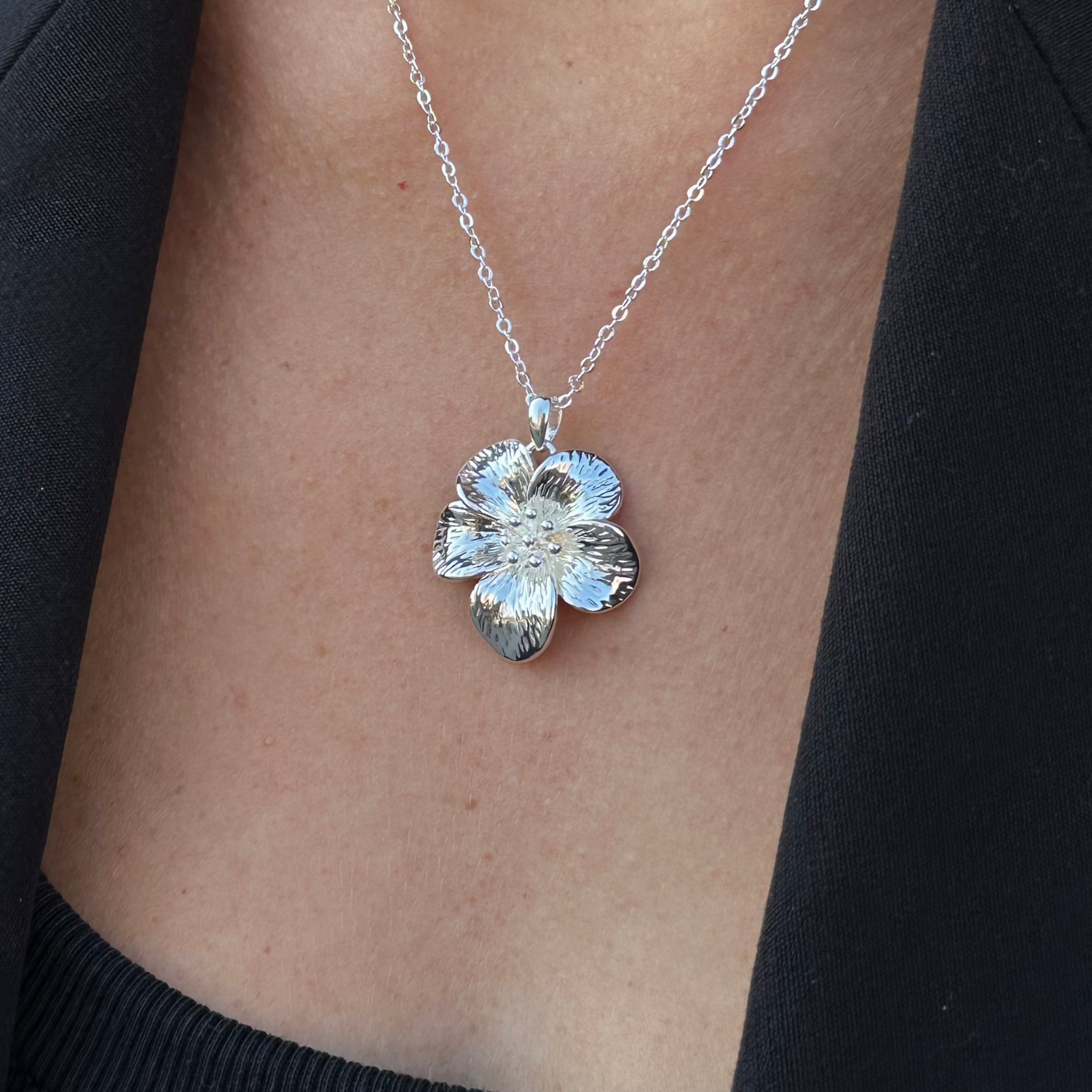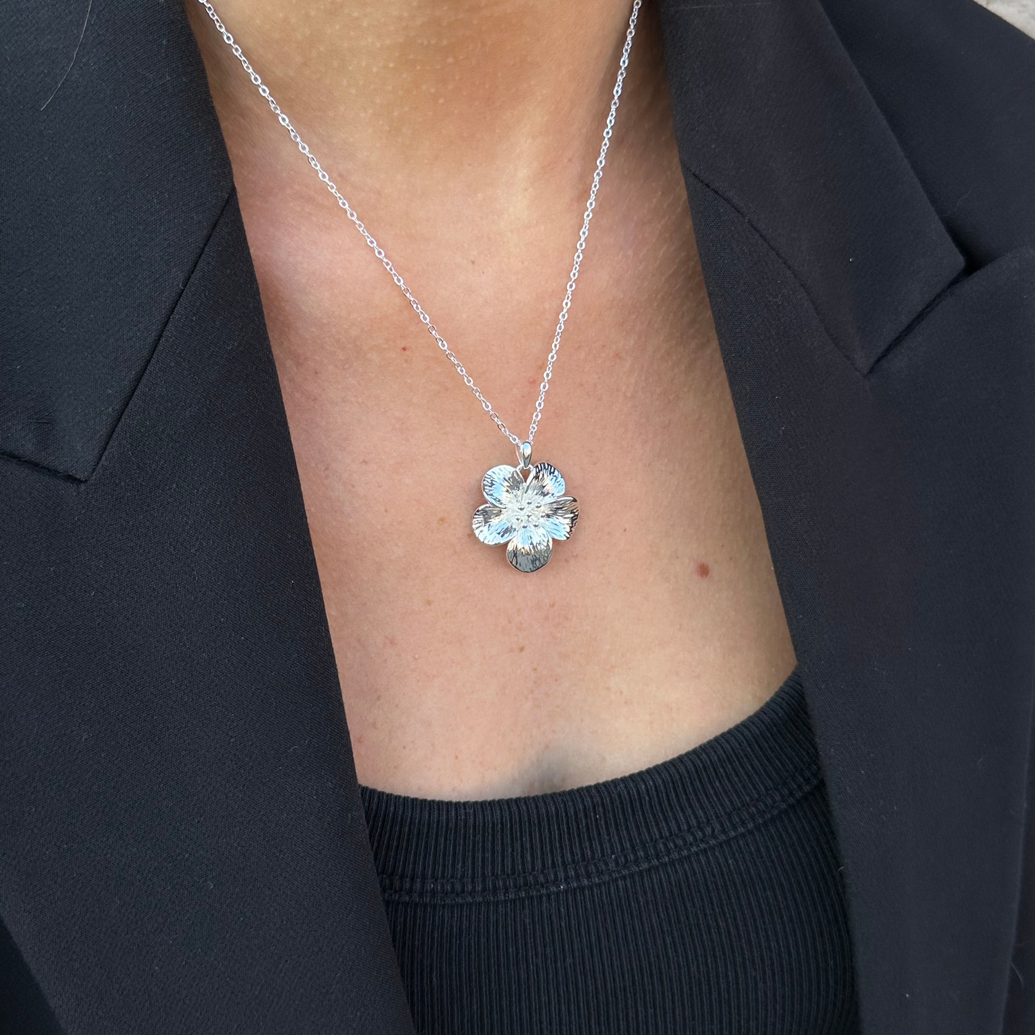 FLOWER NECKLACE - ett elegant halsband med en vackert blommande blomma, en hyllning till naturens tidlösa skönhet. Designad med en nätt kedja med möjlig förlängning för perfekt passform. Levereras vår lyxiga BYBORN smyckesask.