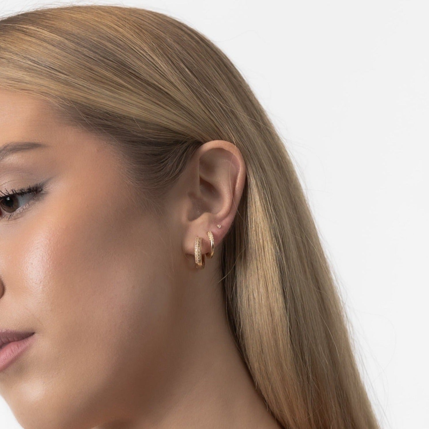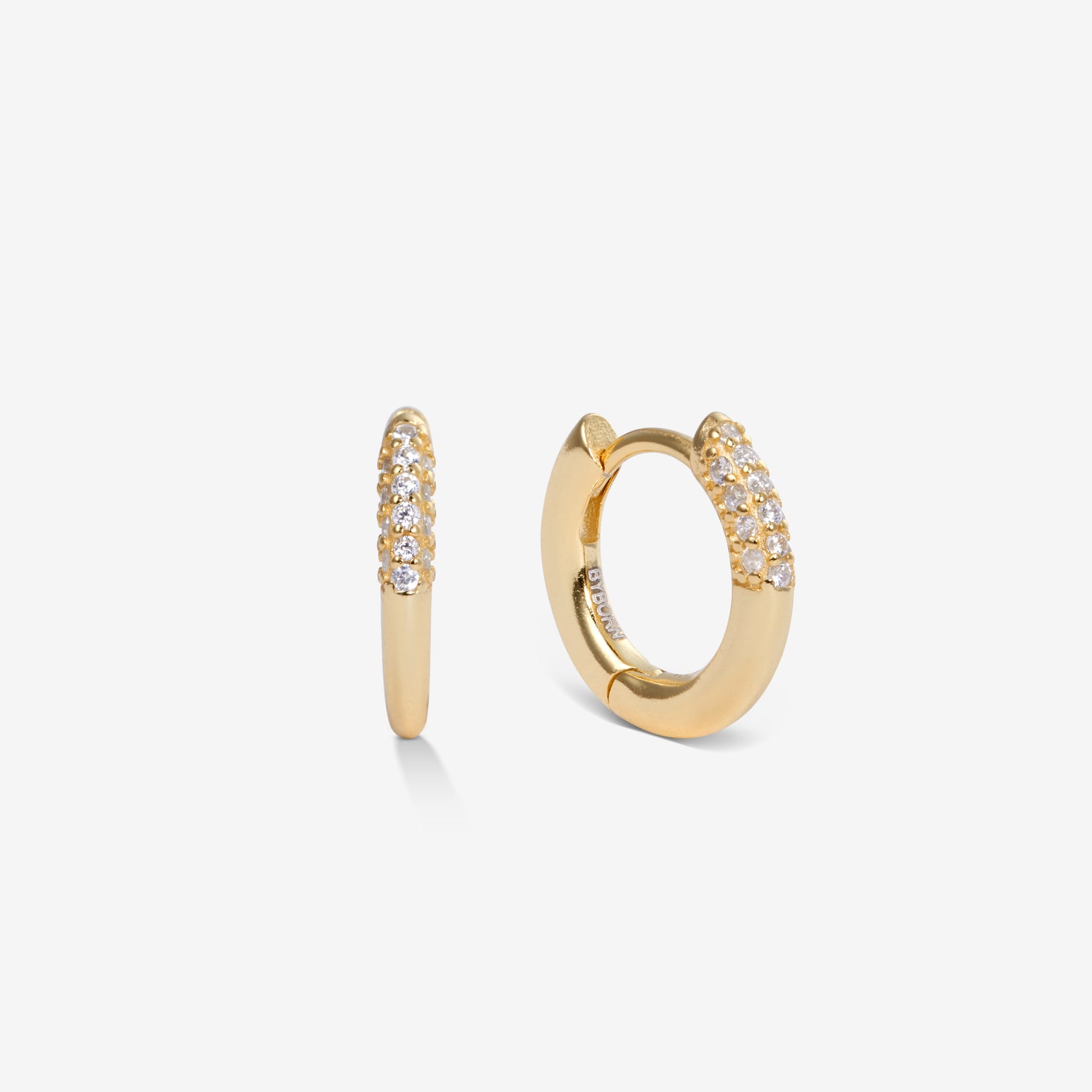 HALF STONED HUGGIES är ett par klassiska men ändå tuffa hoops designade med små zirconia stenar för att skapa ett elegant skimmer. Dessa minimalistiska och glamorösa design gör att de är lika rätt till vardags som till festligare tillställningar. Örhängena är så lätta och bekväma att du glömmer att du har dem på dig. Hoopsen är även perfekta att kombinera med andra mindre hoops eller minimalistiska smycken i samma stil för en komplett look. Finns i 925 sterling silver eller 18k guldplätering. De kommer garanterat att bli dina nya favoriter i din smyckessamling!