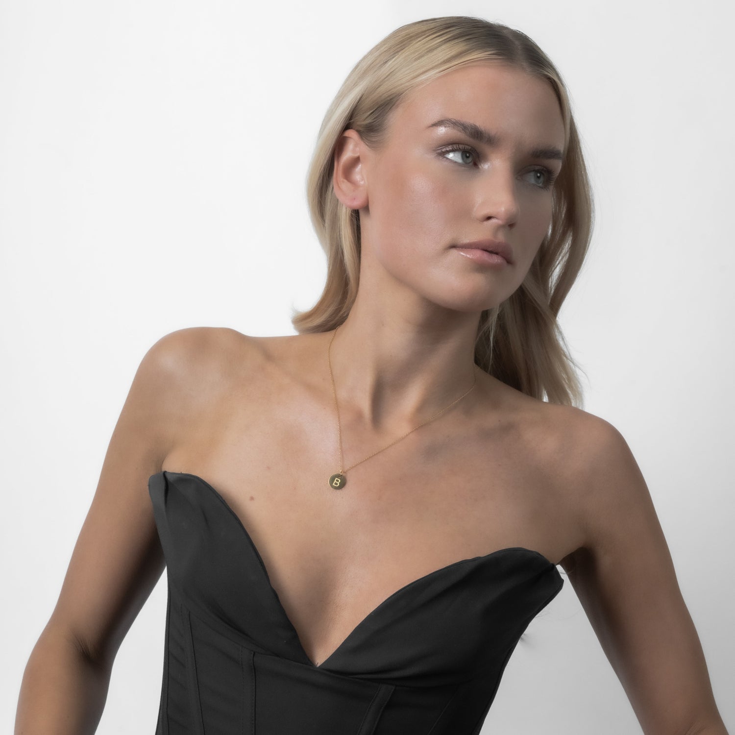 LETTER NECKLACE kan vara både personlig och den perfekta presenten. Detta halsband har en klassisk vacker rund berlock med en graverad bokstav som är perfekt för alla tillfällen. Du kan kombinera två eller flera LETTER CHARMS för att göra looken komplett. Smycket levereras i en lyxig BYBORN-ask.